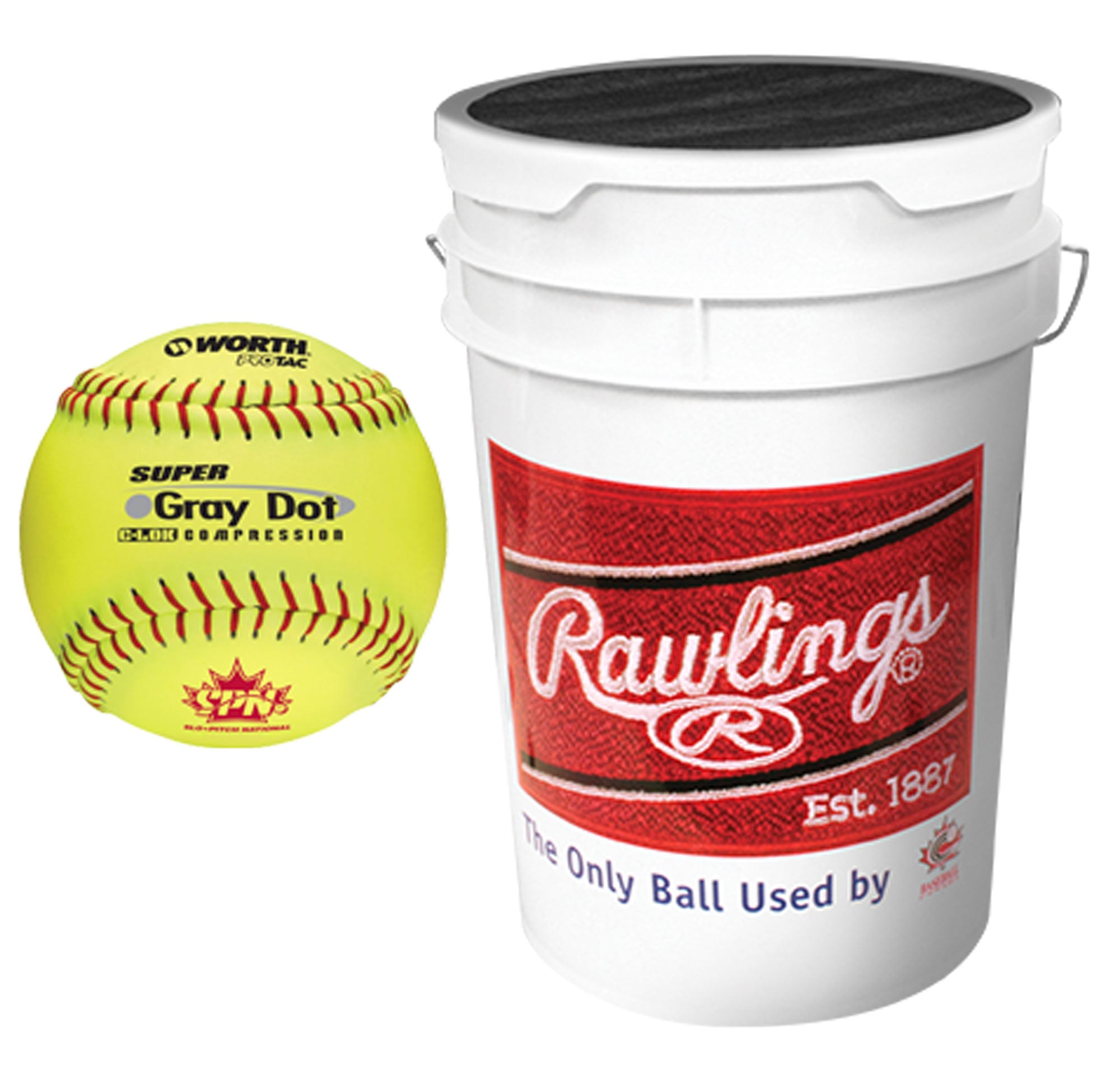 Home Run Sports Bucket Combo includes 2 Dz 12" Optic Yellow Grey dot softballs and a Rawlings Bucket with cushioned lid. Current in stock color: Black bucket with black lid, Rawlings & HRS logos.