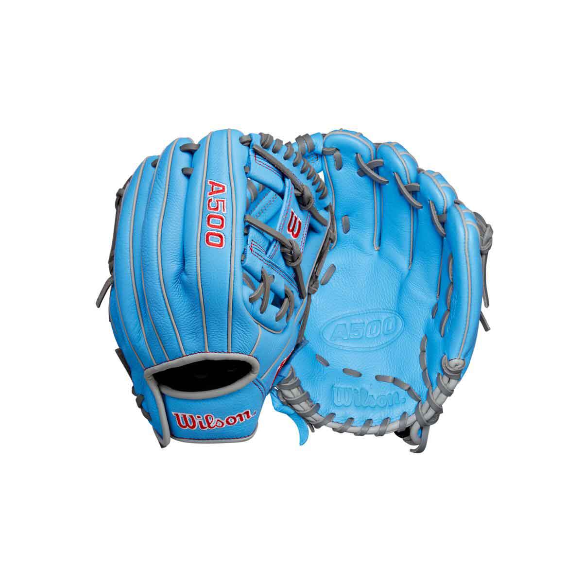 The 11" A500® baseball glove features full leather construction that's soft and ready to play after a quick break-in process, helping young ball players learn the ropes on defense. Cool Blue & Grey Top Grain leather offers a lightweight feel to give players ages 6 and older easy control of the glove, and the self-adjusting Quick Fit Wrist strap hugs the back of the hand. Wilson's iconic H-Web is designed to catch ground balls or pop ups anywhere on the field.